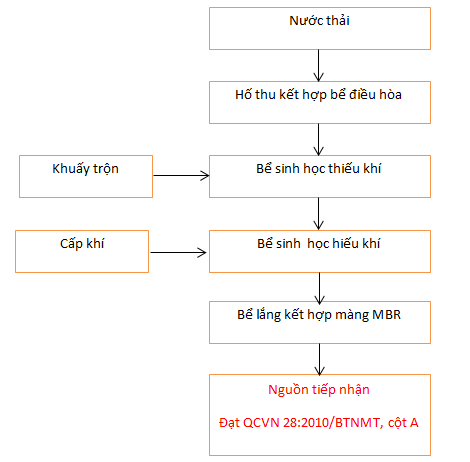 Sau đó nước từ bể sinh học thiếu khí sẽ được dẫn qua bể sinh học hiếu khí kết hợp bể sinh học màng MBR. Tại bể sinh học hiếu khí, vi sinh vật hiếu khí được nuôi cấy và được cung cấp oxy bằng máy sục khí (kết hợp đĩa phân phối dạng tinh, cung cấp đủ lượng oxy hòa tan cho các vi sinh vật phát triển) khử toàn bộ lượng COD, BOD còn lại và chuyển hóa toàn bộ amoni thành Nitrat (sẽ được khử tại bể sinh học thiếu khí). Sau khi nước thải được khử toàn bộ các thành phần ô nhiễm thì nước thải được lọc qua các lỗ màng MBR có kích thước rất nhỏ (< 0,2 mm). Toàn bộ các thành phần ô nhiễm chưa được xử lý triệt để, lượng cặn lơ lửng và các vi sinh vật gây bệnh sẽ được loại bỏ bởi màng lọc MBR. Nước thải sau khi qua bể sinh học hiếu khí kết hợp màng lọc MBR sẽ luôn đạt tiêu chuẩn cột A theo QCVN 28:2010-BTNMT.